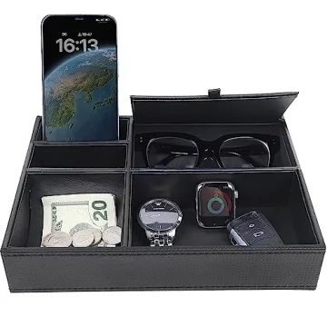 Equipped with five thoughtfully arranged compartments, this valet tray is perfect for storing a multitude of items. One compartment even features a cover, ensuring your essentials remain free from dirt and dust. Whether you are storing your wallet, jewelry, keys, watches, glasses, or remotes, this product efficiently tidies up any space, allowing you to form a habit of organization. The uniquely detent semi-circular shaped compartment provides easy access to smaller items like coins, making this tray as practical as it is stylish.