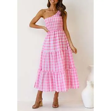 ZCSIA Women's 2024 Summer Boho One Shoulder Sleeveless Solid Color Ruffle Beach Party Tiered Midi Dress,PlaidPink,Medium