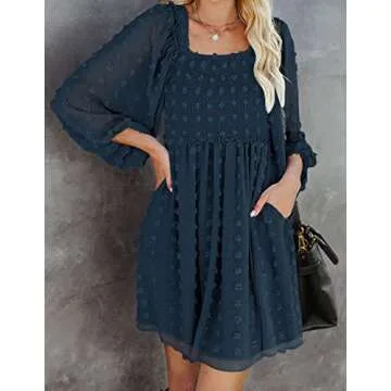 ZCSIA Women's Puff Long Sleeve Square Neck Ruffle Flowy Swiss Dot Babydoll Mini Dress with Pockets,Navy,Small