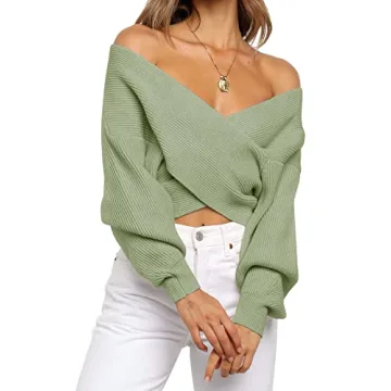 Show more Introducing the **ZCSIA Women's Wrap V Neck Cropped Sweater**, your go-to piece for a cozy yet chic fall wardrobe! This stylish sweater features a unique crossover front design and a flirty off-shoulder style, perfectly highlighting your charming curves. Made from soft, elastic ribbed knit fabric, it ensures comfort without compromising on style. With its cropped length and irregular hem, this sweater pairs wonderfully with high-waisted jeans, skirts, or over a sundress for the ultimate versatile look. Available in a vibrant green to brighten up your autumn ensembles, it’s sure to catch the eye!