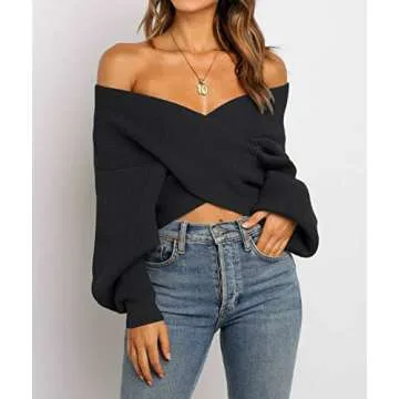 ZCSIA Women's Wrap V Neck Cropped Sweaters 2024 Fall Long Sleeve Cross Front Off Shoulder Solid Knitted Pullover Tops,Black,XLarge