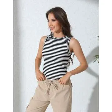 Show moreIntroducing the Zeagoo Striped Tank Tops for Women, a perfect blend of style and comfort for the summer of 2024! These high neck rib knit tops are crafted from a premium stretchy ribbed material that feels luxuriously soft and cozy against your skin. Designed with a slim fit and a unique exposed seaming that gives them a trendy, inside-out look, these sleeveless tops are not just a fashion statement but also provide all-day comfort. Whether you're hitting the beach, heading to a party, or just enjoying a casual day out, this versatile crop top is a must-have in every woman's wardrobe. With a specially designed rounded bottom hem and double-lined cuffs and neckline, it strikes the perfect balance between chic and snug that won’t ride up, ensuring a flattering silhouette.