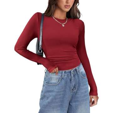 Show moreIntroducing the Zeagoo Tight Long Sleeve Shirt for Women, a perfect blend of style and comfort. Crafted from high-quality soft rayon and spandex, this shirt features a stretchy, breathable ribbed fabric that ensures you stay comfortable all day long. Its slim fit design hugs your body softly, providing a chic silhouette that flatters all body types while the crewneck and long sleeves lend a classy touch. The rich wine red color adds a trendy vibe, making this top a versatile addition to your wardrobe.