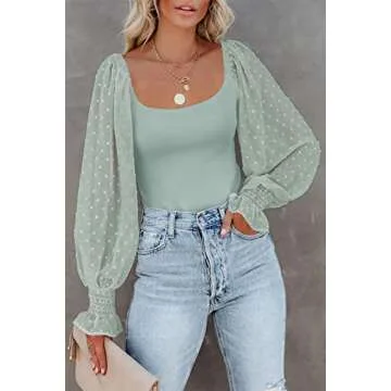 REORIA Women's Fall Sexy Round Neck Front Twist Knot Long Sleeve Sheer Mesh Slimming Ruched Trendy G...