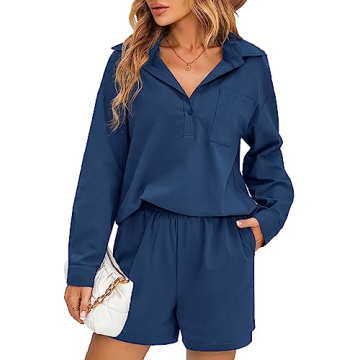 Zeagoo Womens 2 Piece Outfits Lounge Sets Cotton Linen Long Sleeve V-Neck Shirt and Mini Shorts With Pockets