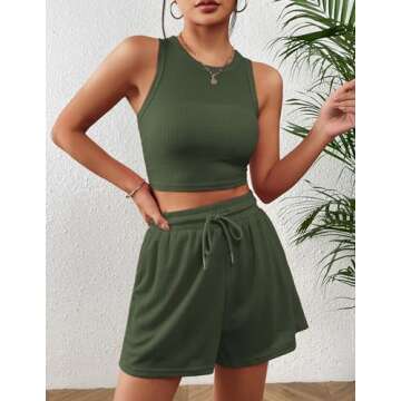 - Design: This two-piece set includes a trendy waffle knit crop top with a crew neck and sleeveless racerback design along with high-waist shorts that feature an adjustable drawstring and two functional pockets.