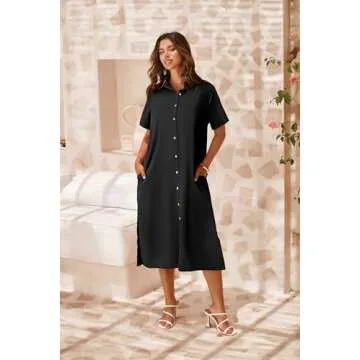 Zeagoo Womens Shirt Dress Summer Button Down Dress Swing Side Slit Midi Dresses with Pockets Black M