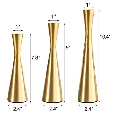 Show moreIlluminate your space with the **ZEAYEA Set of 3 Gold Candle Holders**, designed to seamlessly blend elegance with modern simplicity. Crafted with meticulous attention to detail, these metal taper candlestick holders make a stunning statement in any decor. The set includes three holders of varying heights—small (7.8"), medium (9"), and large (10.4")—perfect for creating a captivating centerpiece. Each holder features a base measuring 2.4" wide and a candle hole sized to fit any standard taper candles with a diameter of 1". With their luxurious electroplated gold finish, these holders are not just functional but also an exquisite artwork for your home.