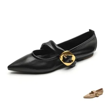Zeberfi Women's Leather Mary Jane Flat Shoes with Adjust Metal Buckle Fashion Closed Pointed Toe Shallow Mouth Slip On Comfortable Luxury Business Wedding Dress Shoes (Black,10)