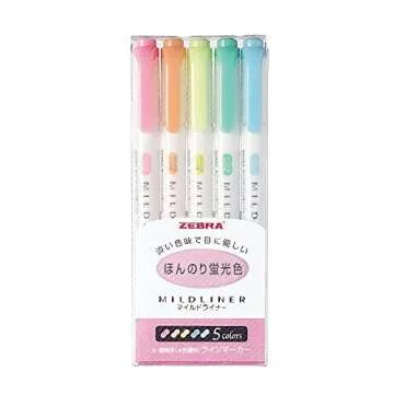Show moreIntroducing the Zebra Mildliner, Double Sided Highlighter, 5 Set (WKT7-5C) - the ultimate note-taking companion that combines functionality with an artistic flair. Created by Zebra, a trusted name in high-quality writing instruments, this set features an exquisite palette of pink, orange, yellow, green, and blue colors, perfect for anyone who appreciates subtlety in their study tools. Forget the harsh brightness of traditional highlighters; these Mildliners deliver a serene, pastel shade that enhances your work without overwhelming your senses. Whether you’re a student, teacher, or just someone who loves to stay organized, these highlighters will surely elevate your experience.