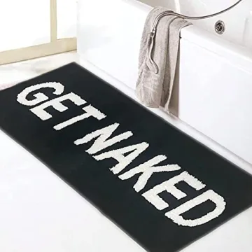 Show more Introducing the Zeeinx Get Naked Runner Bath Mat, designed to bring a delightful mix of style and functionality to your bathroom. Crafted from high-quality microfiber, this plush mat not only provides incredible comfort underfoot but also adds a cheeky touch to your decor with its playful 'Get Naked' lettering in white against a striking black backdrop. It's perfect for those who love to infuse their space with a hint of humor while enjoying the soft, inviting feel of this luxuriously thick rug.