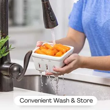 Show moreIntroducing the Zen People Ceramic Berry Basket, an essential addition to your kitchen that streamlines the way you wash and store your fruits and vegetables. Crafted with high-quality stoneware, these reusable ceramic berry bowls feature strategically placed holes that facilitate excellent drainage and airflow, ensuring your produce stays fresh longer. Measuring 5" x 5" x 2.75" each, these berry baskets are perfect for accommodating up to one pint of berries but are also versatile enough for a variety of healthy snacks.
