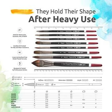Show more Unleash your inner artist with the exquisite ZenART Professional Watercolor Brush Set. This 14-piece collection is expertly designed for watercolor enthusiasts, blending the luxurious softness of squirrel hair with synthetic fibers to create the ideal brush for every technique. The stunning selection includes a variety of brush sizes—from Flats, Rounds, and Filberts to Finer brushes like Rigger and Detail rounds—empowering you to explore a broadened palette of possibilities. Each brush is not just a tool but an extension of your creativity, ready to perform wherever your art takes you.