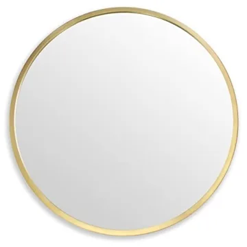 Show moreIntroduce a touch of elegance to your home with the zenmag Round Wall Mirror. This exquisite 24" metal framed round mirror is more than just a reflective surface; it’s a decorative statement piece that enhances the aesthetic of any room. Made with premium materials, this large decorative mirror features a striking gold finish that pairs perfectly with various decor styles, from modern to traditional. Its robust frame adds a touch of luxury while ensuring durability, making it an ideal addition to your bathroom, foyer, bedroom, or living space. The clean lines and round design provide an updated vibe, making it not only functional but also a captivating wall art piece.