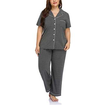 Show moreIntroducing the ZERDOCEAN Women's Plus Size Pajamas Set – your ultimate companion for comfort and relaxation! Crafted from high-quality materials, these soft sleepwear sets feature a short sleeve button-down design that offers both style and ease. With long pants that are designed to provide a secure yet comfortable fit, this pajama set is perfect for lounging at home or enjoying a good night's sleep. The elegant dark gray color adds a touch of sophistication, ensuring you feel stylish even in your sleepwear. Experience restful nights and cozy moments with this perfectly tailored set!