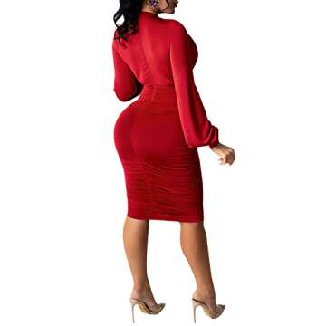 ZERMOM Women's Sexy V Neck Long Sleeve Stretch Bodycon Ruched Party Club Midi Dress Red