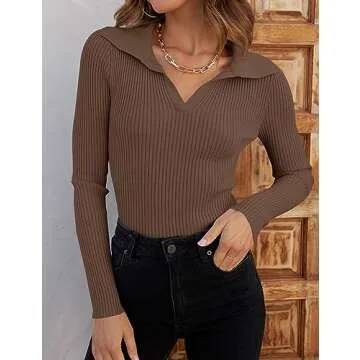 Show moreIntroducing the ZESICA Sweater for Women, a stunning blend of elegance and comfort designed to elevate your seasonal wardrobe! This long sleeve pullover features a fashionable V neckline and an adorable lapel design, ensuring you stand out in any crowd. Crafted with a fine ribbed knit texture, this sweater is not just visually appealing but also made from a skin-friendly fabric that’s soft, cozy, and breathable, providing the perfect balance between style and comfort. Tailored for a slim fit, this top beautifully accentuates your curves while remaining versatile enough to pair effortlessly with a range of bottoms. Available in a rich mocha color, this medium-sized gem is an essential addition to your fall closet.