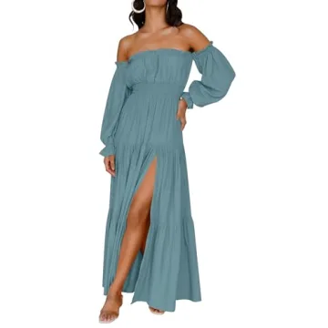 Show moreStep into a realm of elegance and comfort with the **ZESICA Women's 2024 Boho Sexy Off Shoulder Long Sleeve Smocked High Waist Side Split Flowy A Line Tiered Long Maxi Dress**. Crafted with the discerning fashionista in mind, this stunning maxi dress features a unique **off-shoulder design** that flatters your neckline while allowing you to express your personal style. With **long puff/lantern sleeves** that enhance your silhouette, this dress is as versatile as it is visually appealing. Available in a rich **teal color**, it's sure to turn heads while keeping you feeling lightweight and breezy.