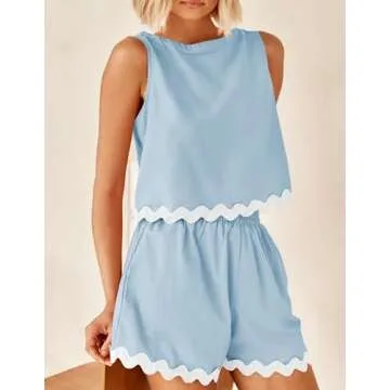 ZESICA Women's 2024 Summer 2 Piece Outfits Set Linen Lace Trim Crewneck Tank Crop Top and Shorts Lounge Pajama Sets,Sky,Medium