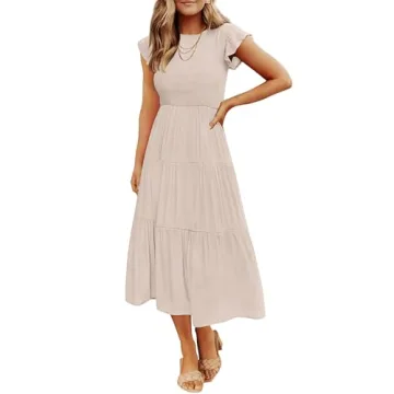 Show moreThis stunning midi dress is the perfect blend of elegance and comfort, brought to you by a brand known for its dedication to quality and style. Featuring a flattering elastic shirred top, this dress hugs the body in all the right places. It boasts a chic crew neck, short cap sleeves, and a high waist design, making it an essential piece for stylish women of all ages. The dress showcases a flowy tiered midi skirt that gently moves with you, embodying a sense of femininity and grace.