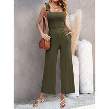 Show moreIntroducing the ZESICA Women's 2024 Summer Casual Spaghetti Strap Smocked High Waist Wide Leg Jumpsuit Romper, a stunning addition to your summer wardrobe. Designed with a focus on comfort and style, this romper is perfect for a sunny day out or a relaxed evening. Crafted from lightweight and breathable materials, it features spaghetti straps and a flattering smocked bodice that accentuates your figure beautifully. The wide-leg design gives it a trendy vibe, making it versatile enough to wear at any occasion. With its delightful army green color, this jumpsuit adds a touch of earthy sophistication to your summer outfits.