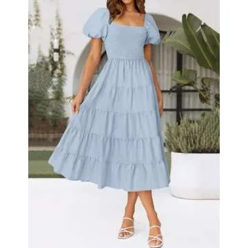 Show more Step into the season with the ZESICA Women's 2024 Summer Square Neck Short Puff Sleeve Solid Color High Waist Casual Smocked Flowy A Line Tiered Midi Dress, a delightful blend of comfort, elegance, and playful sophistication. Perfect for any occasion, this dress accentuates your curves while offering a chic, relaxed fit that feels as good as it looks. Every detail has been meticulously designed—from the cute bubble sleeves to the smocked bust that enhances your silhouette and provides an effortlessly flattering fit, making it a must-have addition to your summer wardrobe.