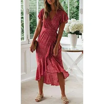 ZESICA Women's 2025 Bohemian Floral Printed Wrap V Neck Short Sleeve Split Beach Party Maxi Dress,Urban Redfloral,Small