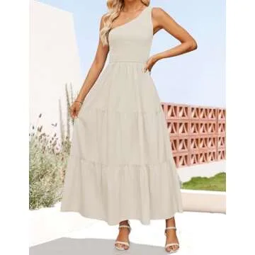 Show moreElevate your summer wardrobe with the ZESICA Women's 2025 Bohemian Summer Floral Print One Shoulder Sleeveless Smocked Ruffle Tiered Beach Long Midi Dress. This stunning dress in a soft beige hue combines sophistication and a romantic bohemian flair, making it the perfect choice for any warm-weather occasion. Its unique one-shoulder design and elastic shirred bust provide a flattering fit for various body shapes, ensuring you feel confident and chic. The ankle-length flowy hem adds an elegant touch, while the sexy open back and gorgeous boho floral print create a striking ensemble that captures attention.