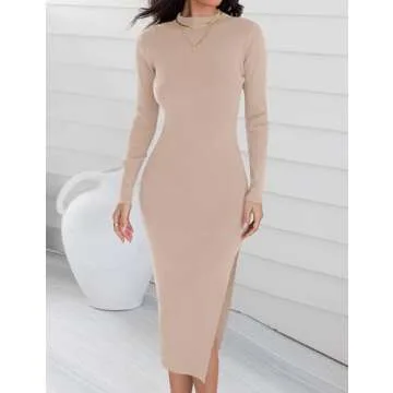 ZESICA Women's 2025 Ribbed Knit Dress | Long Sleeve Mock Neck, Slim Fit, Side Slit