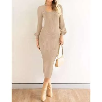 ZESICA Women's 2025 Square Neck Ribbed Knit Dress Puff Long Sleeve Slim Fit Bodycon Fall Winter Pullover Sweater Dress,LightKhaki,Medium