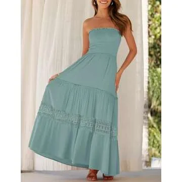 Show moreIntroducing the exquisitely designed ZESICA Women's 2025 Summer Bohemian Strapless Off Shoulder Lace Trim Backless Flowy A-Line Beach Long Maxi Dress, your go-to piece for effortless elegance and playful charm. This stunning maxi dress radiates a breezy vibe, ideal for those warm summer days where style meets comfort. The billowy ruffled skirt gives you freedom of movement, while the feminine elastic waist ensures a flattering fit that accentuates your curves beautifully. Available in a serene sage color and multiple sizes (S=US 4-6, M=US 8-10, L=US 12-14, XL=US 16), this dress caters to every figure, making it a versatile addition to your wardrobe.