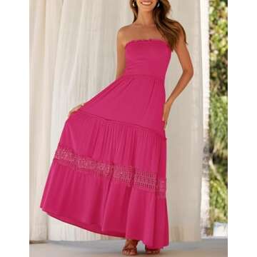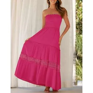 Show moreEmbrace your summer adventures with the ZESICA Women's 2025 Summer Bohemian Strapless Off Shoulder Lace Trim Backless Flowy A Line Beach Long Maxi Dress. This gorgeous maxi dress, available in a delightful rose color, is designed to enhance your silhouette while keeping you comfortable and stylish. With its breezy design featuring a billowy ruffled skirt and a flattering elastic waist, you’ll feel effortlessly elegant no matter the occasion. The exquisite crochet trimming adds a delicate touch, making it perfect for cherished moments at family gatherings, beach vacations, or romantic summer evenings.