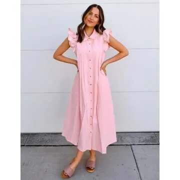 ZESICA Women's 2025 Summer Boho Button Midi Dresses Casual V Neck Flutter Sleeve Belted Long Dresses with Pockets,Pink,Medium