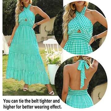Show moreIntroducing the ZESICA Women's 2025 Summer Crossover Halter Neck Sleeveless Plaid Cut Out Backless Flowy A Line Maxi Dress, your quintessential summer companion designed to bring out your confident and stylish side! This dress is perfect for exciting summer outings, featuring a chic crossover halter neckline that adds an alluring touch to your look. Crafted from soft and comfy fabric, its flowy ruffle bottom gracefully dances with every step, ensuring you feel fabulous and free. Available in stunning colors such as Pink, Blue, Light Blue, and Orange, this dress incorporates a classic plaid pattern that elevates your summer wardrobe to new heights.