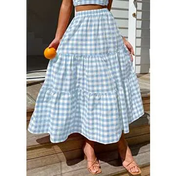 ZESICA Women's 2025 Summer Plaid Flower Elastic High Waist Flowy A Line Maxi Skirt with Pockets,LightBlue,Small