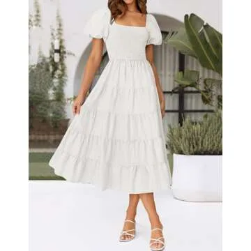The flowing A-line skirt elongates the legs visually, making it the perfect choice for any occasion. The short bouffant sleeves and tiered skirt create a playful silhouette that feels chic yet casual. Whether you're dressing up for a garden party or going for a relaxed beach day, this midi-length dress assures all-day comfort.