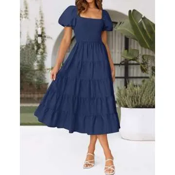 Show moreStep into elegance with the ZESICA Women's 2025 Summer Square Neck Short Puff Sleeve Dress. This stunning midi dress features a cute bubble sleeve and a charming square neck design that perfectly frames your décolletage. Crafted for style and comfort, the dress showcases a beautiful smocked bust and a backless silhouette that exudes femininity. The solid navy color offers versatility, allowing you to pair it effortlessly with various accessories.