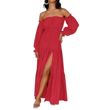 Show more Introducing the ZESICA Women's Boho Sexy Off Shoulder Long Sleeve Smocked High Waist Side Split Flowy A Line Tiered Long Maxi Dress in a vibrant cherry hue. This stunning dress is designed to celebrate your femininity and curves, offering a perfect blend of elegance and comfort. Whether it’s a romantic dinner or a casual outing, this dress will have you turning heads with its chic design. Made with breathable, lightweight rayon, it promises a soft touch against your skin while ensuring effortless style. The high split and flounce sleeves beautifully enhance your silhouette while allowing for easy movement for any occasion.