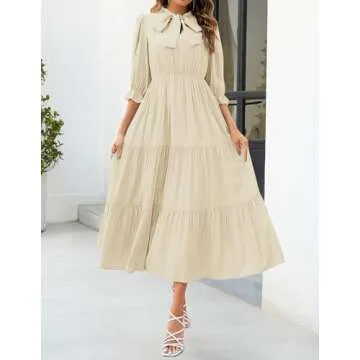 ZESICA Women's Casual Half Sleeve Tie V Neck Elastic High Waist Solid Color Flowy Tiered A Line Beach Party Maxi Dress,Apricot,Small