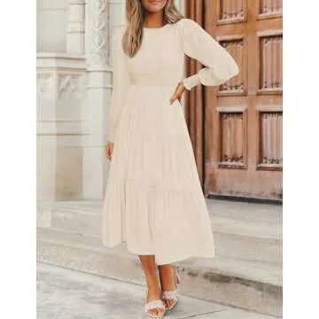 ZESICA Women's Casual Long Sleeve Crew Neck High Waist Smocked Flowy Tiered Midi Dress,Beige,Medium