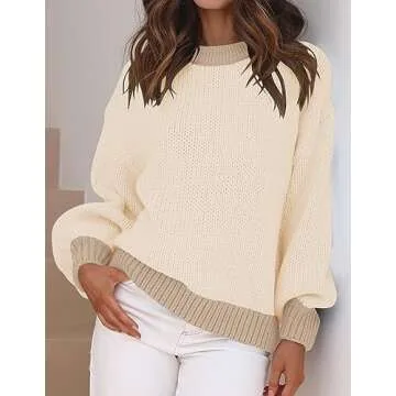 ZESICA Women's Casual Long Sleeve Crew Neck Pullover 2025 Spring Ribbed Knit Loose Contrast Color Sweater Tops,Apricot,Large
