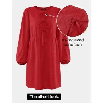 ZESICA Women's Dress Fall Long Puff Sleeve Self Tie Front Babydoll A Line Pleated Cute Mini Tunic Dresses 2025,Red,Large