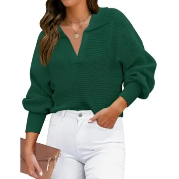 Show more Step into a world of cozy sophistication with our stunning ZESICA Women's Fall Lapel Collar V Neck Long Sleeve Ribbed Knit Comfy Loose Casual Pullover Sweater Jumper Top. This exquisite piece is not just a garment; it's a statement of style and comfort brought to you by ZESICA, a brand renowned for its quality. Made from comfy, lightweight, and warm fabric, it features an alluring sexy v-neck and long batwing sleeves that give it a chic and modern silhouette. The unique lapel design and ribbed knit cuffs add that extra flair, making it the perfect addition to your fall and winter wardrobe.