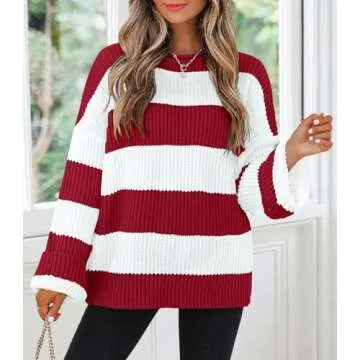 ZESICA Women's Cozy Striped Color Block Oversized Sweater, Red