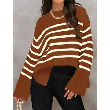 Show more Introducing the ZESICA Women's Fall Winter Striped Long Sleeve Crew Neck Ribbed Knit Side Slit Oversized Pullover Sweater, a perfect blend of style, comfort, and versatility. Crafted with a soft and skin-friendly fabric, this sweater offers a lightweight feel ideal for layering in cooler months. The unique ribbed design and side slit detailing add an extra touch of sophistication, making it the ideal piece for transitioning between seasons. With a round neck and batwing sleeves, its oversized style allows for easy movement and a chic, relaxed fit.