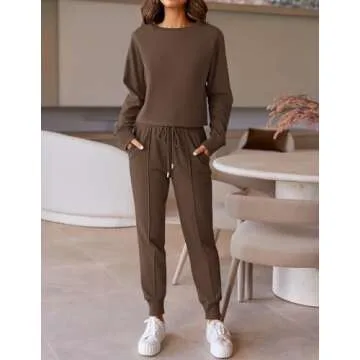 ZESICA Women's Long Sleeve Crop Top and Pants Pajama Sets 2 Piece Jogger Long Sleepwear Loungewear Pjs Sets,Coffee,Small