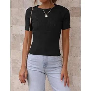 ZESICA Women's Short Sleeve Crewneck T Shirt 2025 Summer Ribbed Knit Slim Fit Basic Solid Color Tee Tops,Black,Medium
