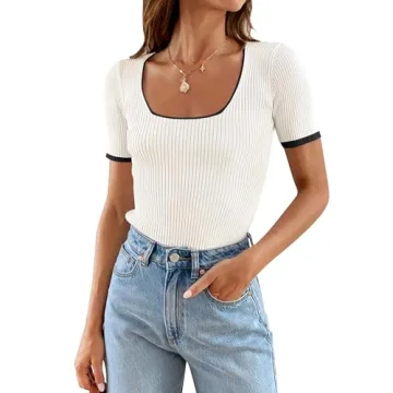 Show more Elevate your wardrobe with the ZESICA Women's Short Sleeve Square Neck Color Block T-Shirt, your go-to piece for both comfort and style in the 2025 summer season. This meticulously designed top features a sexy slim fit that flatters a variety of body types, allowing you to radiate confidence. Crafted from premium quality ribbed knit fabric, it offers a soft touch while ensuring durability, perfect for everyday wear.