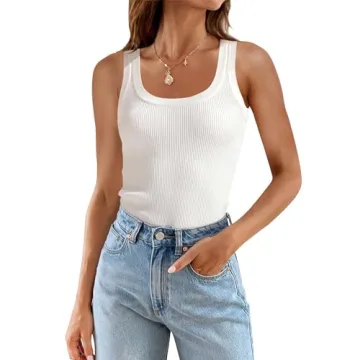 ZESICA Women's Sleeveless Tank Tops Summer Scoop Neck Ribbed Knit Slim Fitted Casual Basic Tee Shirts,White,Large