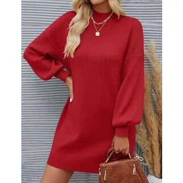 ZESICA Women's Spring Turtleneck Sweaters Dress Oversized Long Lantern Sleeve Casual Knit Pullover Short Dresses,Red,Medium